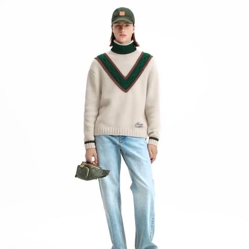 Questa raffinata dolcevita si ispira ai codici sartoriali della campagna britannica. La maglia in lana spessa, in una delicata tonalità beige, è impreziosita da un motivo a trecce effetto 3D color verde a contrasto, che crea una importante “V” sul petto. La stessa nuance si ritrova sul collo dolcevita e sui polsini sportivi a coste, mentre un'elegante firma ricamata completa il bordo sinistro.