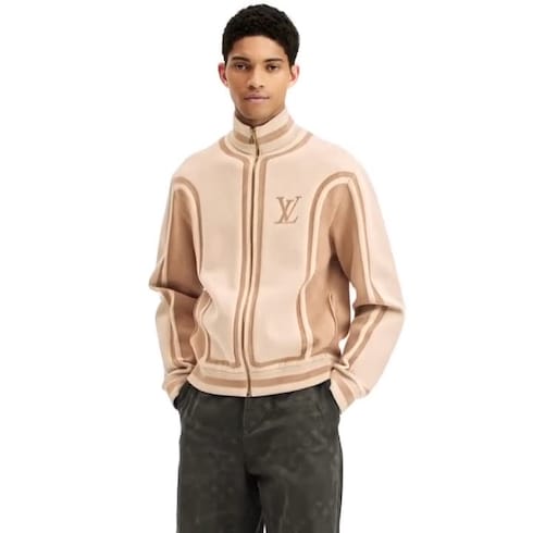 Casual ma raffinata, questa felpa lavorata a maglia con zip è l'ideale per rilassarsi con stile. Il motivo bicolore presenta bande con lavorazione a intarsio d'ispirazione sportiva sulle maniche e sulla parte centrale, riprese su colletto, polsini e bordo a coste. Le iniziali LV nella stessa lavorazione impreziosiscono il petto, mentre una raffinata firma Vuitton orna il retro. Le diverse tonalità sono valorizzate da impunture differenti che creano un sofisticato effetto 3D.