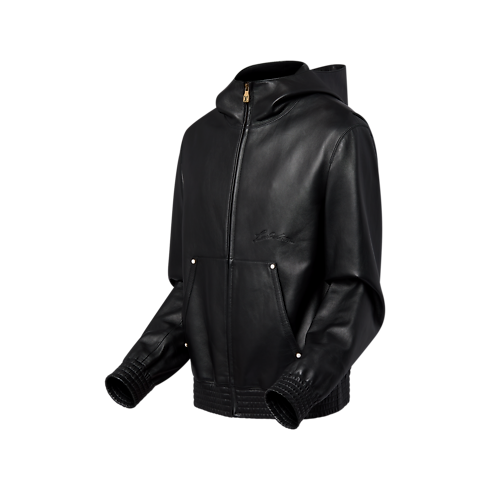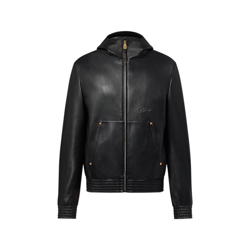 La felpa, realizzata in lussuosa e leggera pelle di agnello, è un'elegante creazione della note contemporanee. L'originale modello con cappuccio è impreziosito dall'emblematica firma Louis Vuitton in rilievo sul petto, mentre l'applicazione "Marque L.Vuitton déposée" sul retro aggiunge un ulteriore tocco iconico. Le piccole borchie effetto perla e il bordo arricciato completano l'esclusivo capospalla.