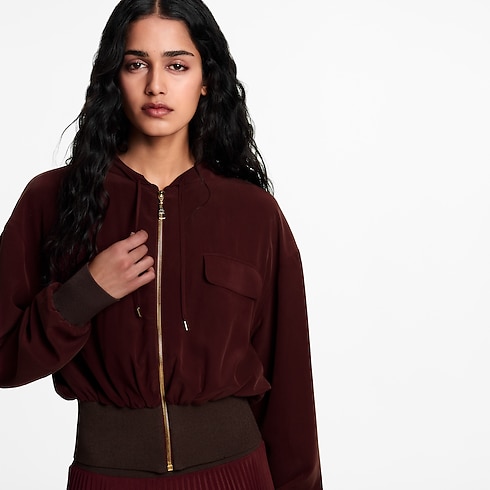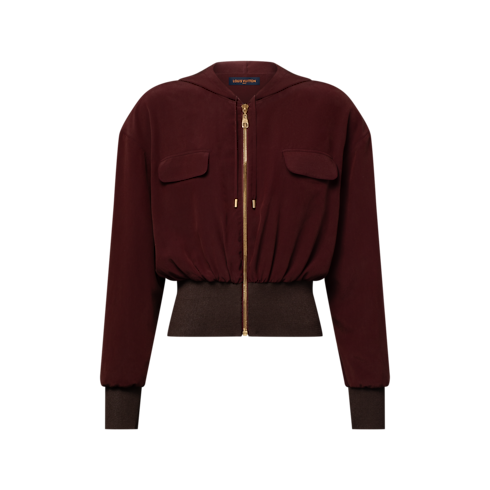 La giacca, che unisce spirito sportivo e raffinata eleganza, è realizzata in fluido crêpe di seta in un'intensa tonalità caratteristica della stagione. La vita e i polsini a coste spesse esaltano il volume del modello, mentre due tasche con patta sul petto donano struttura. La creazione è completata da un cappuccio con coulisse e da una sofisticata chiusura dorata con zip.