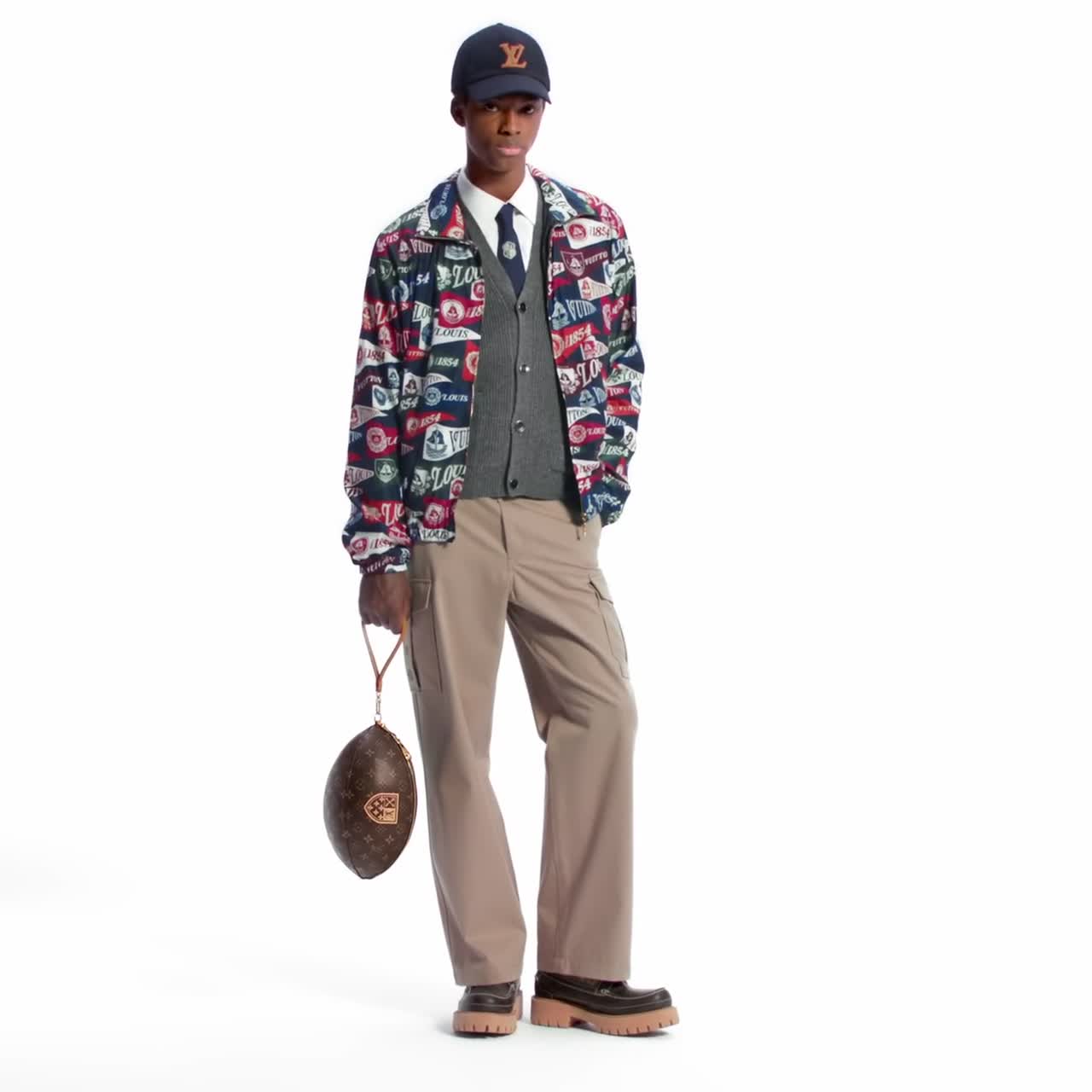 La giacca a vento in tessuto tecnico impermeabile, con fondo e polsini elasticizzati, è impreziosita dal motivo LV Club Flags di ispirazione college. Le firme della Maison spiccano nella vivace stampa di gagliardetti, a contrasto con la base di colore blu navy. L'esclusivo modello, dotato di zip integrale, è completato dalla fodera con decoro iconico.
