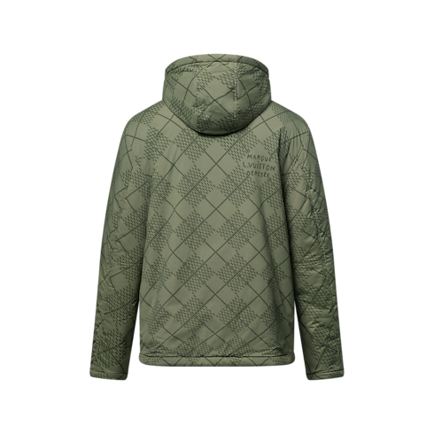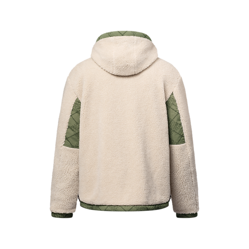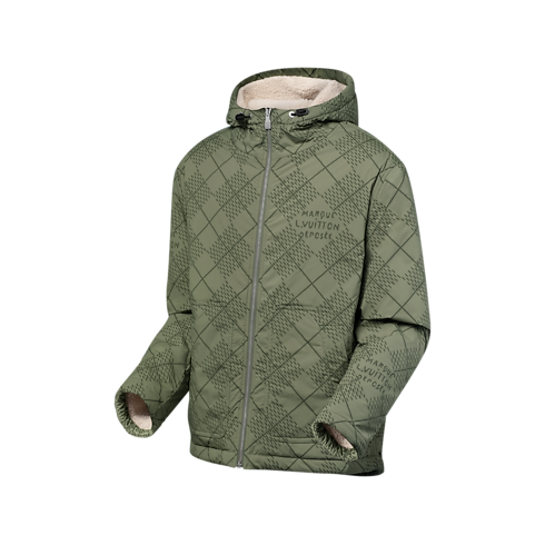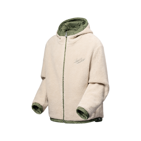 La giacca a vento è reinterpretata in un'originale versione invernale dalla silhouette reversibile. Il modello presenta un lato in tessuto tecnico verde con motivo Damier Argyle stampato all-over e firme "Marque L. Vuitton déposée", mentre l'altro è realizzato in pile color crema con iniziali LV ricamate a contrasto. La versatile creazione è perfetta per la mezza stagione.