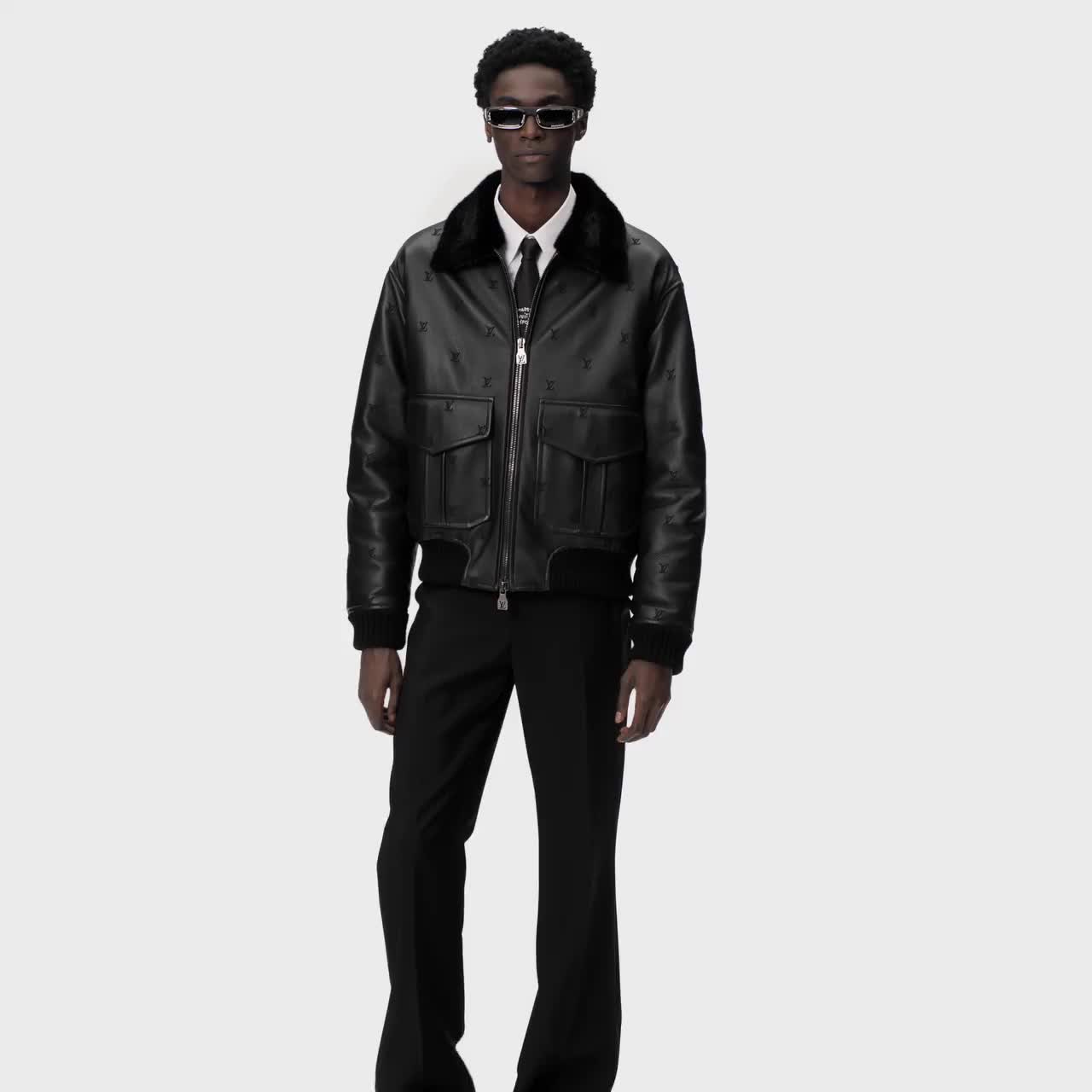 La giacca, proposta per la sfilata Primavera-Estate 2024, è reinterpretata in lussuosa pelle di vitello martellata. L'originale modello stile aviator presenta un morbido colletto tono su tono in visone, mentre l'elegante martingala sul retro aggiunge un raffinato tocco sartoriale. La firma LV Blason ricamata all-over completa l'audace capospalla, ideale per qualsiasi look casual.