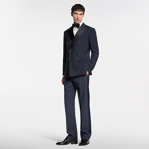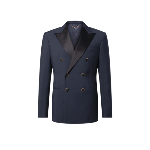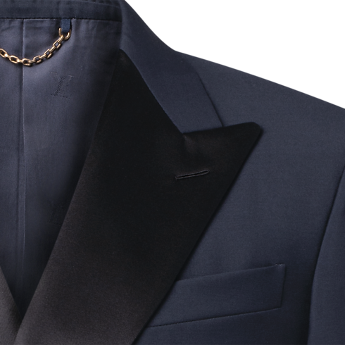 Questa giacca da smoking dal taglio impeccabile è realizzata in raffinata lana grain de poudre color blu navy, impreziosita da un revers a lancia in satin nero. I bottoni iconici, ornati da dettagli in strass incastonati nel metallo dorato, impreziosiscono la parte anteriore, mentre un decoro LV intessuto valorizza il retro. La creazione può essere abbinata ai pantaloni coordinati per un look elegante e senza tempo.