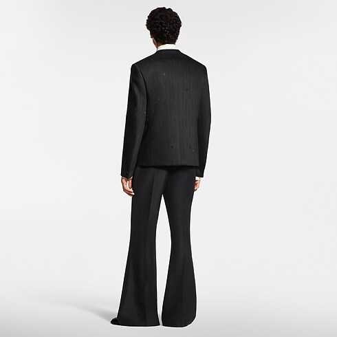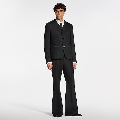 Questa esclusiva giacca da sera nera si ispira all'iconico modello senza colletto introdotto da Pharrell Williams. La silhouette minimalista, caratterizzata da uno scollo a V e da tasche con profili in satin, è ulteriormente impreziosita da sottili righe di strass scintillanti che incorporano elementi del motivo Monogram. I dettagli sui polsini con iniziali LV e i bottoni iconici aggiungono una nota preziosa. Questo capo, riccamente decorato, aggiunge un tocco sofisticato a qualsiasi look per le occasioni speciali.