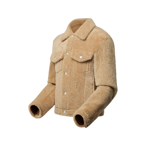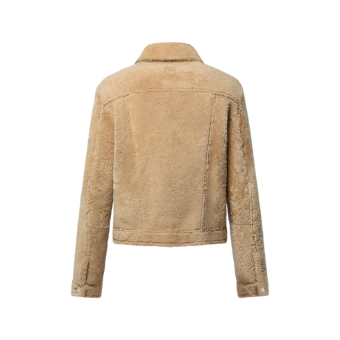 La giacca in shearling, nei toni del beige, reinterpreta in chiave lussuosa un classico del guardaroba casual. La parte interna di colletto, tasche, polsini e vita è impreziosita da dettagli in pelle con motivo Monogram impresso. I bottoni effetto perlato con logo Louis Vuitton inciso e l'applicazione con firma "Marque L. Vuitton déposée" sul retro aggiungono un'ulteriore nota distintiva.
