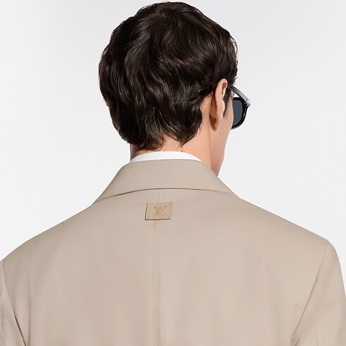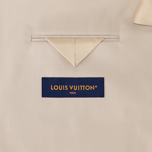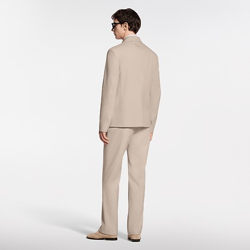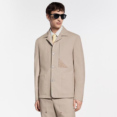 Questa giacca sartoriale in stile workwear rappresenta un'elegante e moderna aggiunta al guardaroba formale. Realizzata in una raffinata tela di misto cotone e seta color beige, è leggera e traspirante, perfetta per l'estate. L'applicazione di forma triangolare in pelle tono su tono, lavorata con motivo Damier e arricchita dalle iniziali LV in metallo, decora la parte sinistra del petto. I pantaloni coordinati completano con naturalezza l'ensemble.