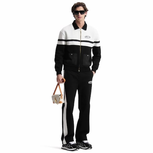 Il giubbotto ibrido con zip presenta uno stile spiccatamente sportivo, ideale per viaggiare. Il modello, realizzato in leggero jersey di cotone nel classico colore nero, è movimentato da inserti in piqué testurizzato a contrasto sulle spalle e sul petto. La firma della Maison ricamata sul davanti aggiunge un tocco distintivo alla creazione, che può essere indossata insieme ai pantaloni abbinati.