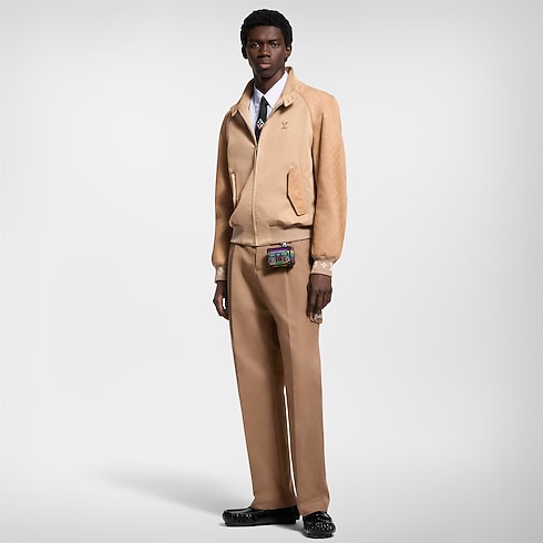 Il giubbotto Preppy, con corpo in gabardine di cotone, è rinnovato dai dettagli in pelle scamosciata con decoro Damier impresso. Il capo è impreziosito dal motivo Monogram tono su tono lavorato a intarsio all'interno del colletto e sui polsini, abbinato alle iniziali LV in metallo sul petto. Le calde tonalità beige donano al modello un'allure di elegante versatilità.