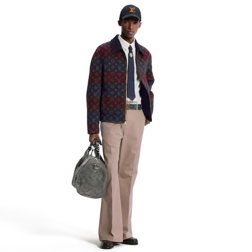 Il giubbotto in stile workwear double face reversibile è realizzato in misto lana, cachemire e seta. Il lato in tinta unita presenta il dettaglio metallico con firma LV sul petto, mentre l'altro è movimentato dal motivo Monogram Heritage in trama jacquard a righe sui toni del blu navy e del burgundy. L'esclusiva creazione può essere indossata dal giorno alla sera.