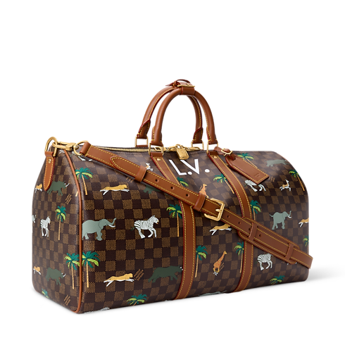 L'iconica tela di cotone Damier Ébène Heritage, impreziosita da giraffe, rinoceronti ed elefanti estrosi, rende la borsa Keepall Bandoulière 50 un pezzo unico. Parte della Collezione LV x The Darjeeling Limited, presenta manici superiori e fasce laterali marroni, oltre a dettagli metallici color champagne. Le iconiche iniziali L.V. esprimono un perfetto equilibrio tra eleganza e charn ironico.