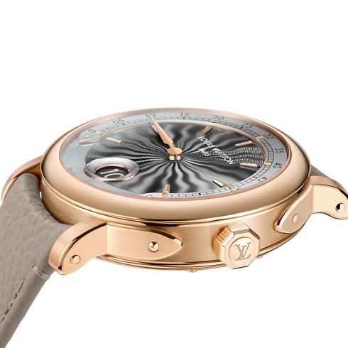 Seguendo fedelmente i codici tradizionali del nsettore, l'orologio Louis Vuitton Escale Minute Repeater 40 mm in oro rosa 18 carati è un'espressione di maestria artigianale, in cui il tempo viene sia visto sia udito sotto forma di una bellissima sinfonia. Questo movimento manuale combina una ripetizione minuti con heures sautantes e minuti retrogradi. Un dettaglio di raffinata eleganza: il centro del quadrante è realizzato nella laboriosa lavorazione a mano effetto ghiglioscé, che dà vita a un motivo fiammeggiante capace di catturare la luce in modo impeccabile.