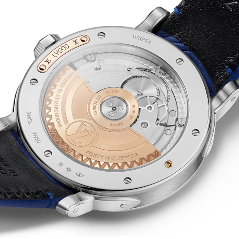 L'orologio Louis Vuitton Escale Worldtime 40 mm in platino è il principale orologio Louis Vuitton e incarna l'arte del viaggio della Maison. Ogni elemento della cassa, modellata come un baule in miniatura e impreziosita da finiture manuale senza precedenti, si armonizza perfettamente per esaltare il tempo come la caratteristica più preziosa. L'orologio Escale Worldtime presenta un esclusivo calibro di fattura Louis Vuitton, che indica i principali 24 fusi orari attraverso le iniziali delle città, mentre il disco delle heures sautantes offre un modo intuitivo e raffinato di leggere l'ora. Sul quadrante, la realizzazione delle bandiere in 25 diversi colori effettuata a mano ha richiesto oltre 80 ore di lavoro, utilizzando la raffinata tecnica dello smalto Grand Feu. Il centro del quadrante presenta un tourbillon volante a forma di iconico fiore Monogram.