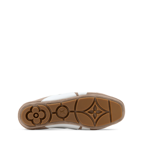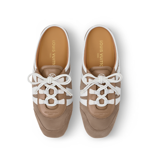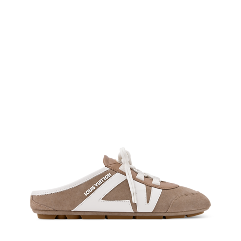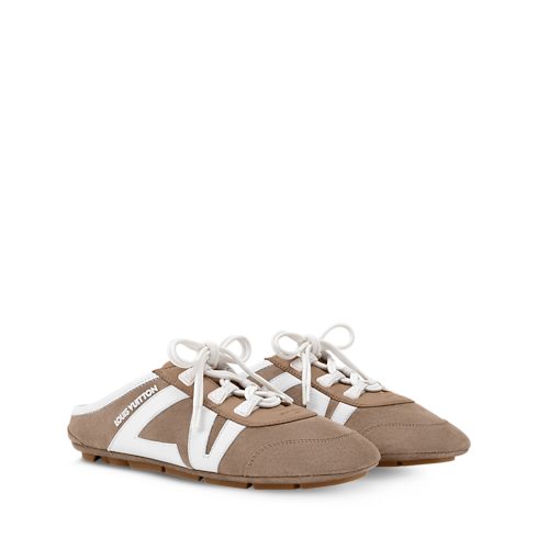 La calzatura LV Sneakerina aperta sul retro, che unisce il design di una sneaker e quello di una ballerina, completa l'emblematica linea con una versione slip-on dallo stile casual. La tomaia in pelle di vitello scamosciata è impreziosita dalle dinamiche iniziali della Maison in pelle di vitello liscia e dalla firma Louis Vuitton in gomma. Questo modello è eccezionalmente leggero e flessibile, grazie alla lavorazione a sacchetto e alla suola in TPU.
