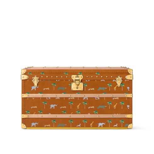 Ispirato al film The Darjeeling Limited, il baule Courrier Lozine 90 è proposto in una versione in raffinata pelle color cuoio dal fascino vintage. Vivaci illustrazioni di animali e palme donano un’estetica preppy e al tempo stesso naïf, evocando l’universo affascinante e nostalgico della pellicola. Il baule è numerato "11" in omaggio al film.