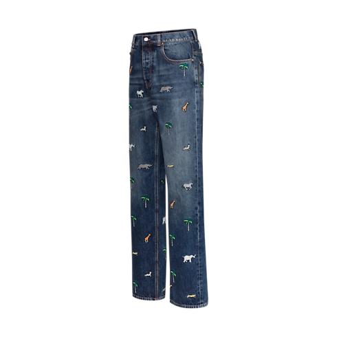 I pantaloni skate in denim, dalla grafica distintiva, sono impreziositi dall'iconico motivo LV x The Darjeeling Limited della sfilata Primavera-Estate 2026, caratterizzato da vivaci ricami raffiguranti palme e animali all-over. I dettagli emblematici includono il ricamo L.V.M. sulla tasca posteriore destra e un elemento in nubuck con motivo Mini Damier. Il capo può essere abbinato alla camicia coordinata.