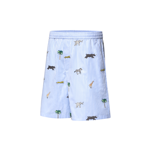 Gli shorts a righe sono declinati in una tonalità di azzurro chiaro e impreziositi dal motivo LV x The Darjeeling Limited della sfilata Primavera-Estate 2026. Ricami all-over dal sapore nostalgico celebrano l'arte del viaggio, mentre la firma Louis Vuitton Paris ricamata rifinisce delicatamente la tasca posteriore. La camicia a maniche corte coordinata crea un outfit estivo impeccabile.