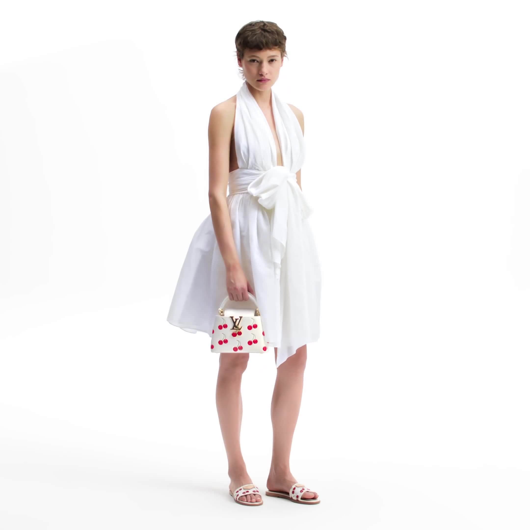 La borsa Capucines Mini LV x TM, parte della nuova Collezione Louis Vuitton x Murakami, rivisita in chiave originale l'iconico modello. L'elegante accessorio, dall'allure estiva, è proposto in vacchetta con scintillanti elementi in metallo dorato, tra cui le emblematiche iniziali della Maison sul davanti. L'esclusiva creazione si distingue per il vivace motivo con ciliegie, realizzato nell'inconfondibile stile dell'artista giapponese.