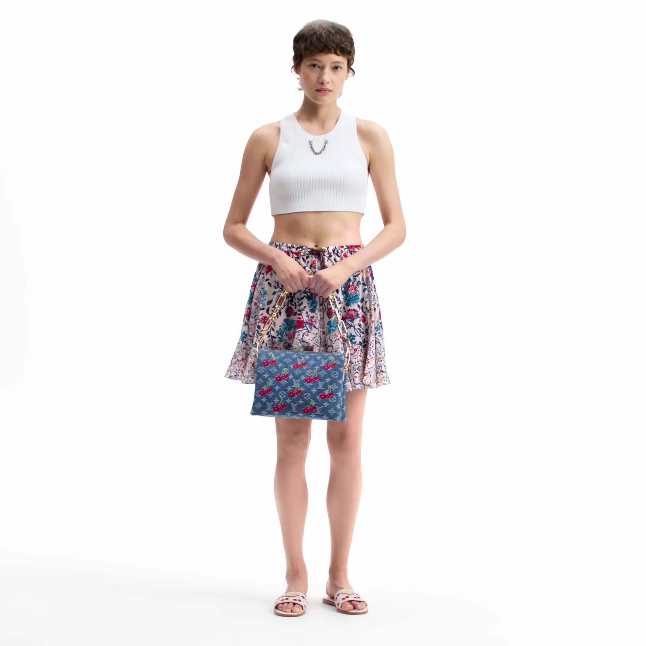 La borsa Coussin PM LV x TM è frutto della collaborazione per la nuova Collezione Louis Vuitton x Murakami. L'accessorio è realizzato in denim con decoro Monogram, arricchito dal vivace motivo con ciliegie ricamate dell'artista giapponese. La catenella dorata e la tracolla regolabile in pelle consentono molteplici opzioni di utilizzo, mentre il capiente interno può contenere l'essenziale, come uno smartphone.