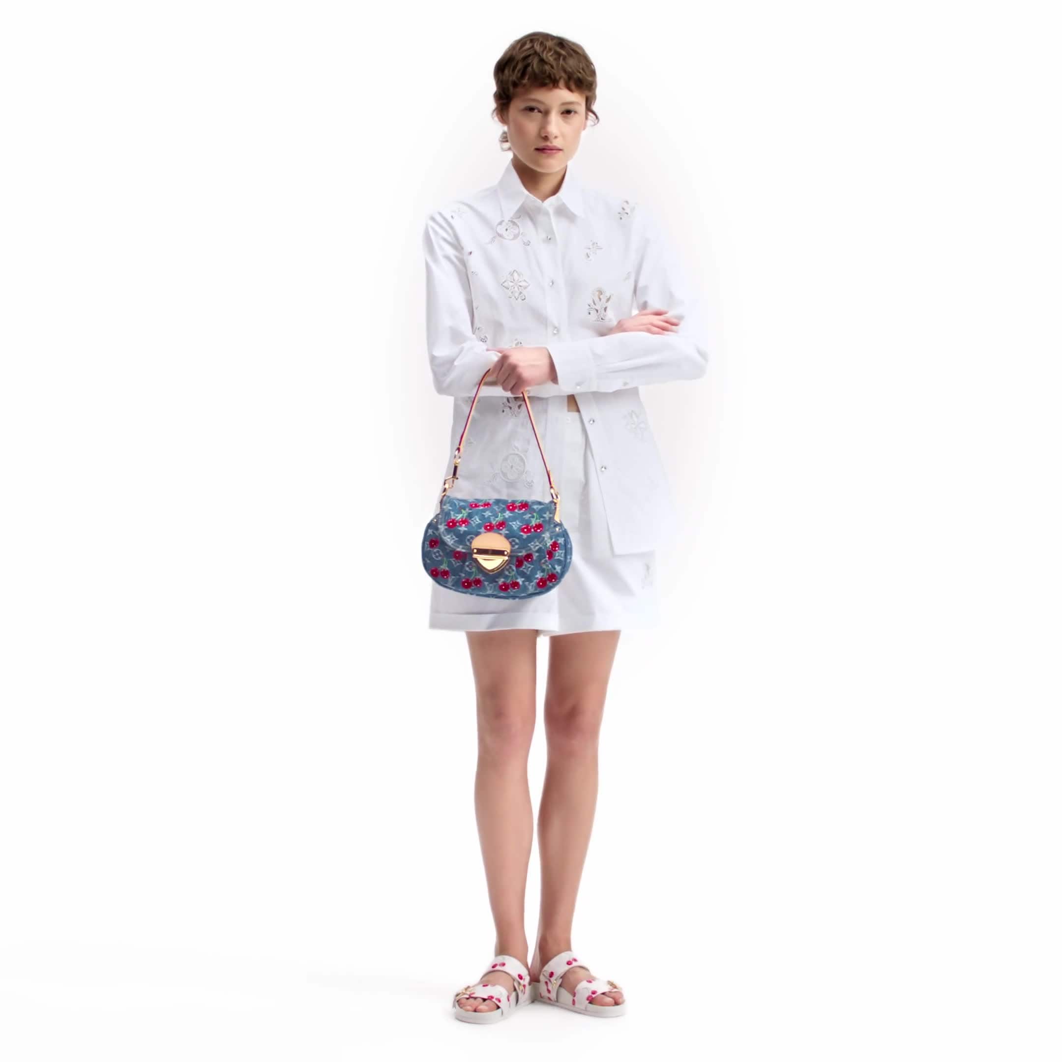 La borsa Sunset LV x TM, dall'accattivante design di ispirazione vintage, è parte della nuova Collezione Louis Vuitton x Murakami. Il modello, dalle linee arrotondate, è realizzato in denim con motivo Monogram, arricchito dalle vivaci ciliegie ricamate distintive dell'artista giapponese. L'emblematica chiusura tuck-lock oversize e la tracolla in pelle naturale con borchie completano la creazione.