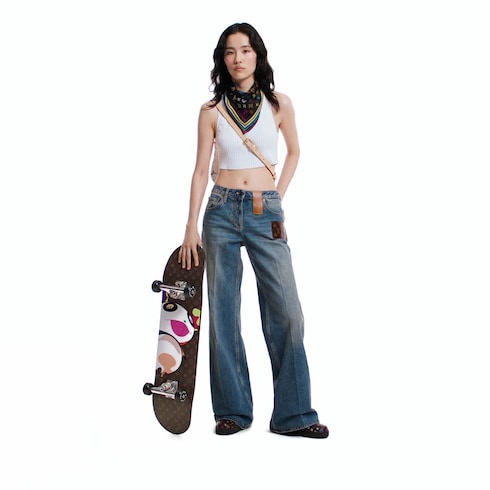 La sneaker LV Trainer LV x TM, parte della nuova collezione Louis Vuitton x Murakami, reinterpreta un modello iconico in un'originale versione in pelle di vitello martellata. La creazione, ispirata alle calzature sportive vintage, è decorata dal motivo Monogram multicolore, omaggio all'estetica esuberante dell'artista giapponese. La tomaia è impreziosita dalla firma in corsivo, mentre il retro riporta il numero 54, in riferimento al 1854, anno di fondazione della Maison.