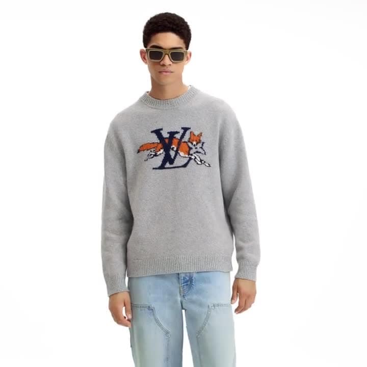 Questa maglia girocollo a maniche lunghe si distingue per il vivace motivo lavorato a intarsio ispirato alla campagna britannica, con grandi iniziali LV e una volpe che salta stringendo un fiore Monogram. È realizzata in un pregiato filato di lana e cachemire color grigio chiaro ed è impreziosita sul retro da un’applicazione in pelle color vacchetta naturale con la firma Marque L.Vuitton Déposée. Un capo avvolgente ed essenziale per la stagione.