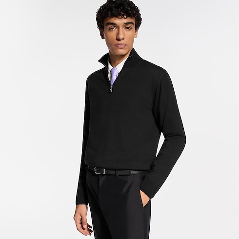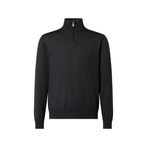 Il maglione nero con mezza zip, realizzato in pregiato misto lana, seta e cachemire. Il modello in maglia fine, ideale per l'estate, presenta la firma della Maison ricamata sul bordo sinistro e un'applicazione in pelle con iniziali LV sul retro. L'intramontabile creazione può essere indossata aperta sopra una camicia o chiusa come un dolcevita.