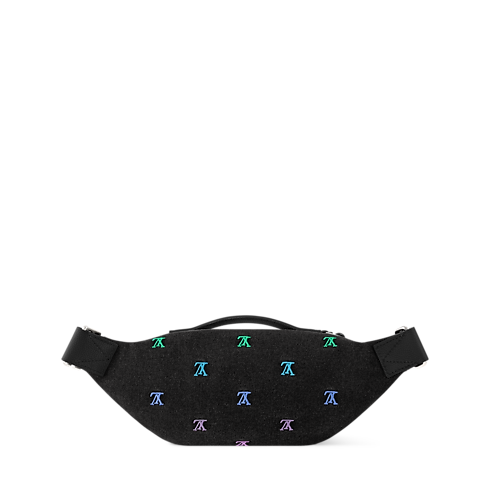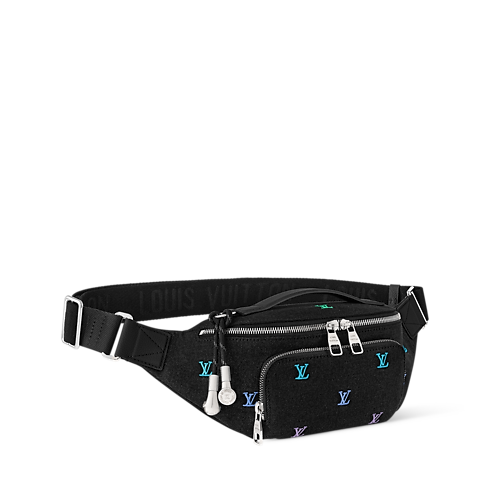 Il marsupio Rush, in denim lavato, è decorato dalle firme LV Blason ricamate, vivace rivisitazione delle iconiche iniziali di Louis Vuitton. L'accattivante modello presenta una tasca anteriore con zip, che consente di accedere facilmente a smartphone e carte di credito. L'accessorio, dotato di cintura regolabile, è impreziosito dal charm a forma di auricolari creato da Pharrell Williams per la linea.