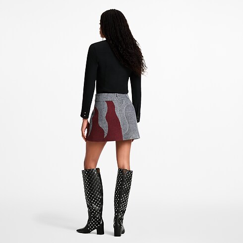 Questa minigonna di grande impatto richiama l’araldica medievale con un gioco grafico di jacquard a contrasto che mette in risalto entrambi i lati. È realizzata in lana con una silhouette essenziale, una fascia in vita ampia che valorizza la figura, e si chiude con una zip invisibile sul retro per una finitura pulita. La creazione è completata da una fodera in seta.