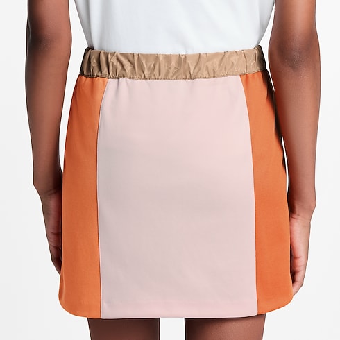 Vivaci sezioni a contrasto, realizzate in jersey di misto cotone, rinnovano questa minigonna con uno spirito ironico e sportivo al contempo. Il taglio è lineare e dritto, impreziosito da due tasche laterali con zip. La vita è valorizzata da un inserto in seta decorato dal motivo Monogram e regolata da una coulisse rifinita dalle perline iconiche di Louis Vuitton, perfettamente coordinate nei colori.
