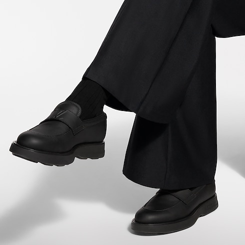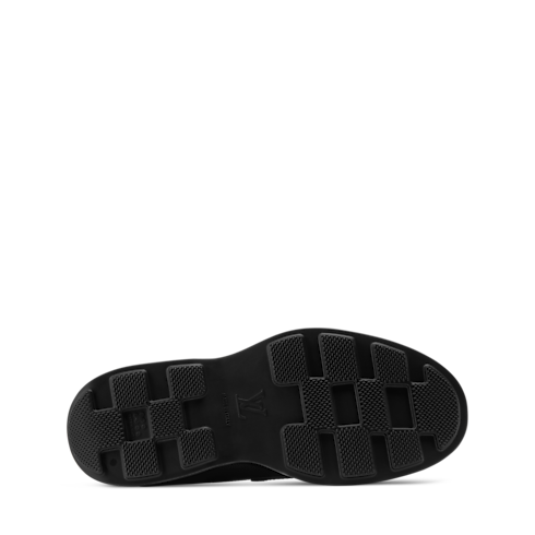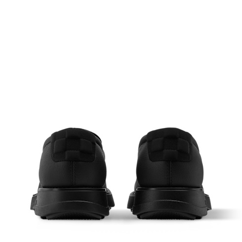 Il mocassino Bastille è realizzato in pelle di vitello martellata LV Aerogram, emblematica delle creazioni di pelletteria di Louis Vuitton, che si distingue per l'eccezionale resistenza e la finitura opaca. La fascetta sulla tomaia è impreziosita dalle iniziali della Maison, mentre il dettaglio in neoprene sul retro è decorato dal motivo Damier impresso. La suola in gomma, spessa ma leggera, completa l'esclusivo modello.