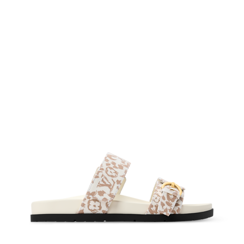 La mule bassa Bom Dia viene reinterpretata in tela con la stampa Monogram Leopard, protagonista della stagione. Questo modello si distingue per i due cinturini regolabili, uno chiuso da una fibbia dorata e l'altro con velcro impreziosito dalle iniziali LV. La calzatura è completata dalla comoda soletta anatomica e dalla flessibile suola in gomma.