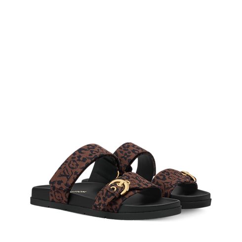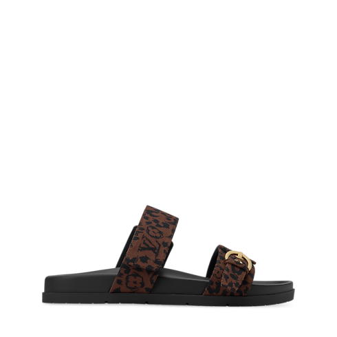 La mule bassa Bom Dia viene reinterpretata in tela con la stampa Monogram Leopard, protagonista della stagione. Questo modello si distingue per i due cinturini regolabili, uno chiuso da una fibbia dorata e l'altro con velcro impreziosito dalle iniziali LV. La calzatura è completata dalla comoda soletta anatomica e dalla flessibile suola in gomma.