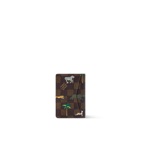 L'organizer tascabile assume un aspetto ironico grazie alla tela Damier Heritage, il cui motivo a scacchiera è animato da vivaci animali in movimento e palme sia all'interno che all'esterno. Le audaci iniziali L.V. color bianco sulla parte anteriore richiamano i celebri bagagli Louis Vuitton apparsi nel film The Darjeeling Limited. Cinque tasche interne, tre fessure per carte e una tasca esterna garantiscono la massima funzionalità.
