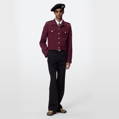 I pantaloni, presentati alla sfilata Primavera-Estate 2024, sono realizzati in twill di lana color nero con un raffinato taglio svasato. Il versatile modello è perfetto da abbinare con fantasia alle altre creazioni d'ispirazione dandy della linea, per look dallo stile unico. Il capo può anche essere indossato con la giacca doppiopetto coordinata, per un completo di grande eleganza.