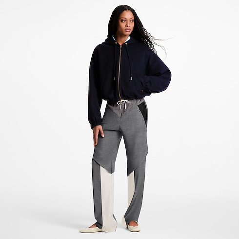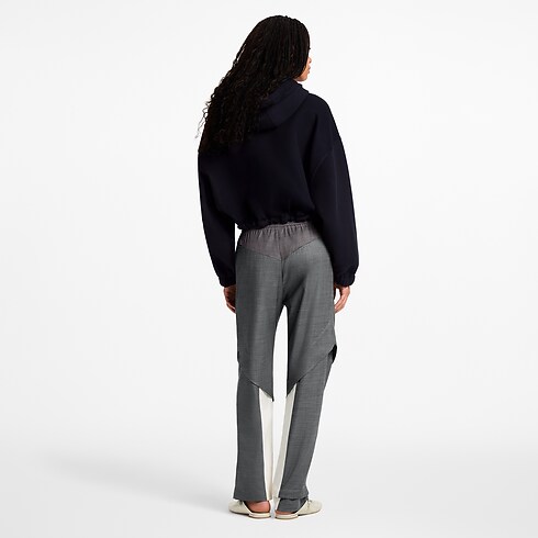 Questi pantaloni da jogging sono reinterpretati in raffinata lana sartoriale con inserti color block che creano un contrasto sportivo, e arricchiti da dettagli grafici con motivo Monogram sulle tasche laterali. Le cuciture conferiscono struttura alle ginocchia, mentre la cintura in vita è regolata da una coulisse. Il modello è completato da molteplici tasche con chiusura e dall'iconica firma LV Twist in metallo sul fianco.
