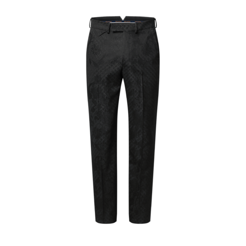 I pantaloni a sigaretta sono realizzati in lana con vestibilità Pont Neuf. L'esclusivo modello è impreziosito dal motivo Monogram Wildflowers in trama jacquard tono su tono e da due dettagli, di cui uno triangolare con le iniziali LV sul fianco e uno con firma "Marque L. Vuitton déposée" sul retro della vita. La creazione può essere abbinata alla giacca coordinata.