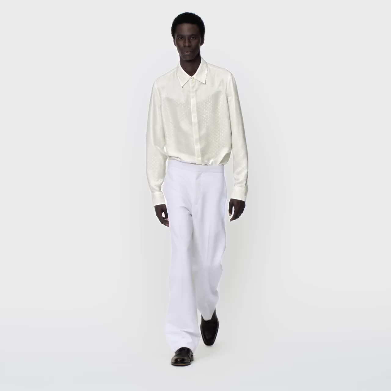 I pantaloni sartoriali da sera sono realizzati in grain de poudre di misto lana color bianco. L'elegante modello, dal taglio drappeggiato, presenta raffinati inserti dello stesso tessuto sul lato esterno di ciascuna gamba, che donano un tocco contemporaneo. Il capo può essere abbinato al gilet e alla giacca coordinati, per un look perfetto per gli eventi estivi più formali.