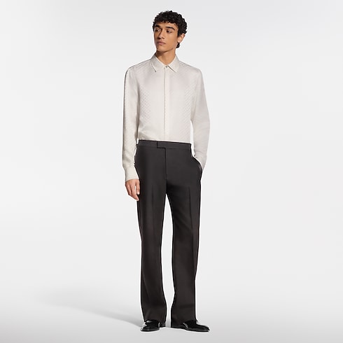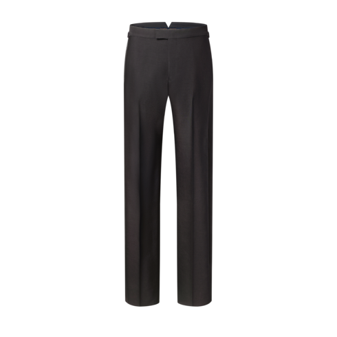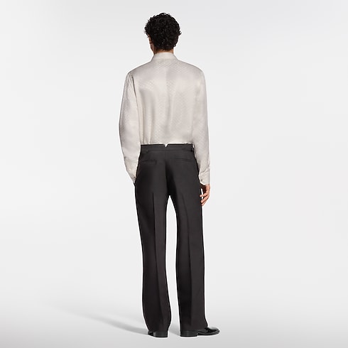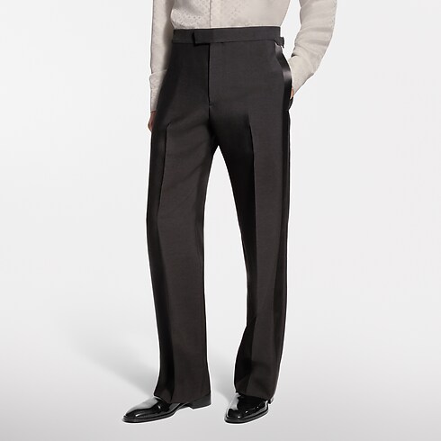 I pantaloni da smoking sono un capo di notevole eleganza, realizzato in crêpe di lana e seta drappeggiato color nero, impreziosito da originali fasce in satin lungo il lato esterno di ciascuna gamba. La vita regolabile esalta la silhouette, mentre le borchie con fiore Monogram sui dettagli aggiungono un tocco distintivo. La camicia e la giacca coordinata completano il raffinato look da sera.