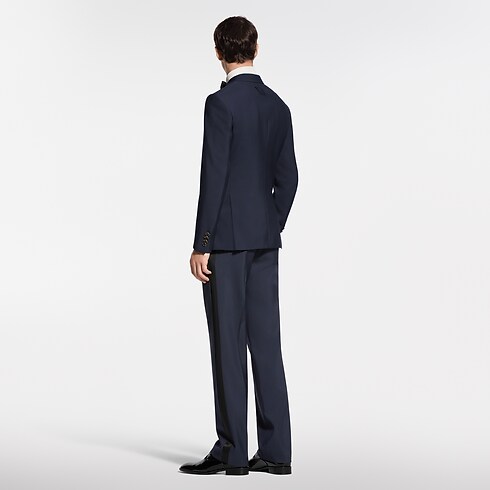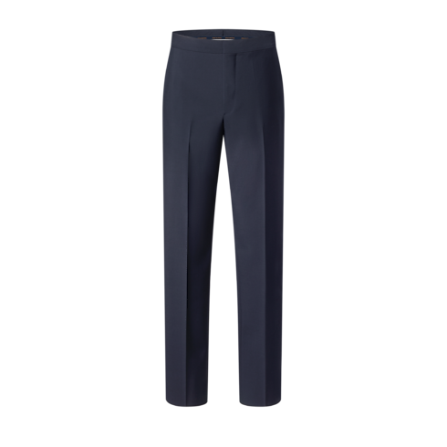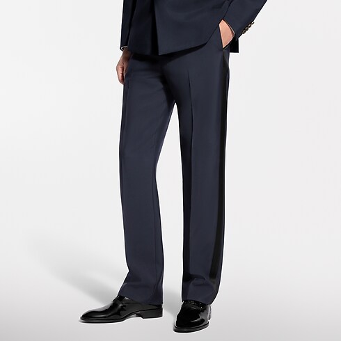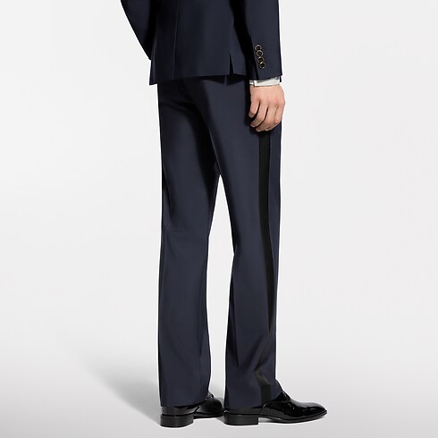 Questi pantaloni da smoking, dal taglio sartoriale impeccabile, presentano una vestibilità a sigaretta che valorizza la silhouette. Realizzati in pregiata lana grain de poudre color blu navy, sono impreziositi da fasce in satin nero lungo il lato esterno di ciascuna gamba e da tasche posteriori con profilo in satin. Il dettaglio con iniziali LV intessuto decora con eleganza il retro della vita. La giacca doppiopetto coordinata è abbinabile per creare un completo da sera raffinato e senza tempo.