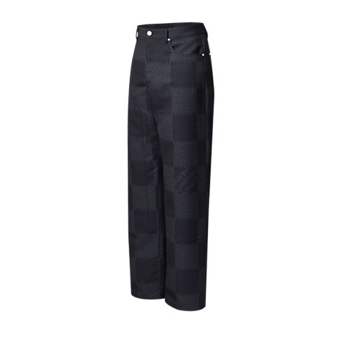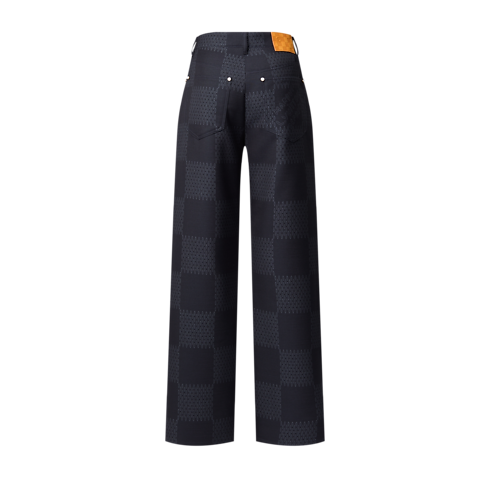 I pantaloni rivisitano il classico taglio dei jeans a cinque tasche in una versione in pregiata lana. Il modello è impreziosito dal motivo Damier oversize con lavorazione jacquard, proposto in eleganti sfumature di blu con effetto testurizzato e firme "Marque L. Vuitton déposée" incorporate nella trama. La creazione, completata dal bottone e dalle borchie perlati, si abbina alla giacca coordinata.