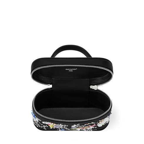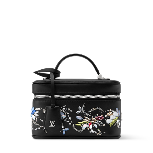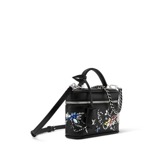 La pochette Vanity con catenella, parte della Collezione Eden, si distingue per gli eccezionali ricami. Impreziosito da cristalli e gemme multicolori, l'accessorio è proposto in pelle di vitello color nero e include un dettaglio intrecciato dorato, che può essere comodamente rimosso. Il porte adresse in pelle rende omaggio all'iconica arte del viaggio e al savoir-faire della Maison.