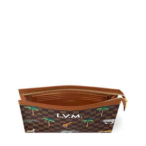 La Pochette Voyage MM è realizzata in pregiata tela Damier Heritage, impreziosita da finiture in pelle color marrone chiaro e da una morbida fodera in cotone. Parte della collezione The Darjeeling Limited, omaggio di Pharrell Williams al celebre film in cui spiccano valigie su misura Louis Vuitton, l'accessorio è decorato con una stampa fantasiosa di animali selvatici e palme. All'interno, uno scomparto con zip comprende una tasca posteriore.