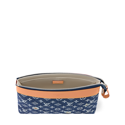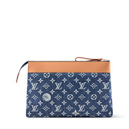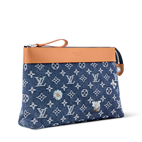 La pochette Voyage Souple, dalle distintive linee morbide, è rivisitata in tela Monogram Flowers Denim con finiture in vacchetta. L'iconico motivo, volutamente imperfetto, è impreziosito dai raffinati dettagli floreali ricamati, che donano al modello un'allure casual-chic. L'interno, foderato in tessuto color écru, presenta una tasca posteriore con chiusura magnetica per un ulteriore tocco di praticità.