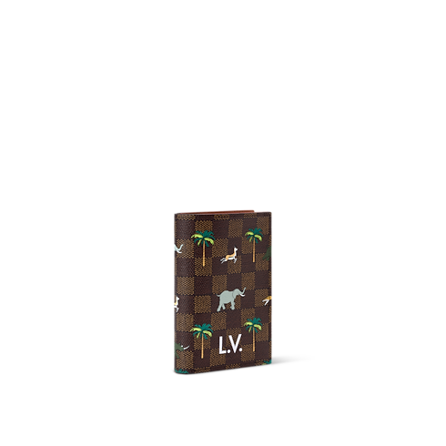 Parte della Collezione The Darjeeling Limited, il porta passaporto è realizzato in iconica tela di cotone Damier Heritage, impreziosita da una giraffa e un elefante che corrono tra le palme. Firmato dalle iniziali L.V., ispirate ai bauli Louis Vuitton presenti nel film, al suo interno svela quattro fessure per carte di credito, due tasche aperte e una tasca piatta.