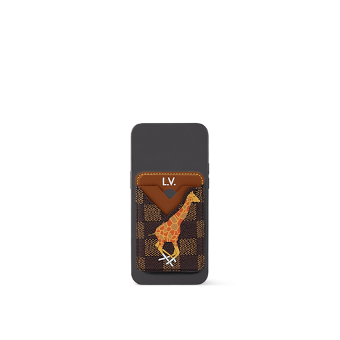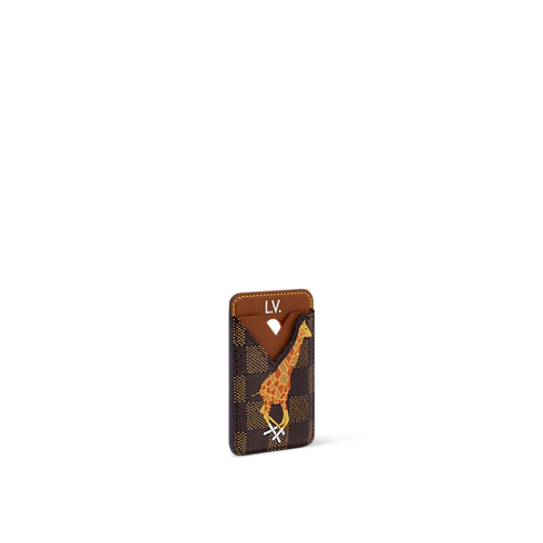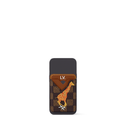 Realizzato in iconica tela di cotone Damier Heritage e pelle, il portacarte di credito magnetico è impreziosito da una stampa raffigurante una giraffa in corsa, creata per celebrare il film The Darjeeling Limited secondo la visione della Maison. Questo accessorio si aggancia facilmente a qualsiasi iPhone compatibile con tecnologia MagSafe e presenta due fessure per carte a forma di V.