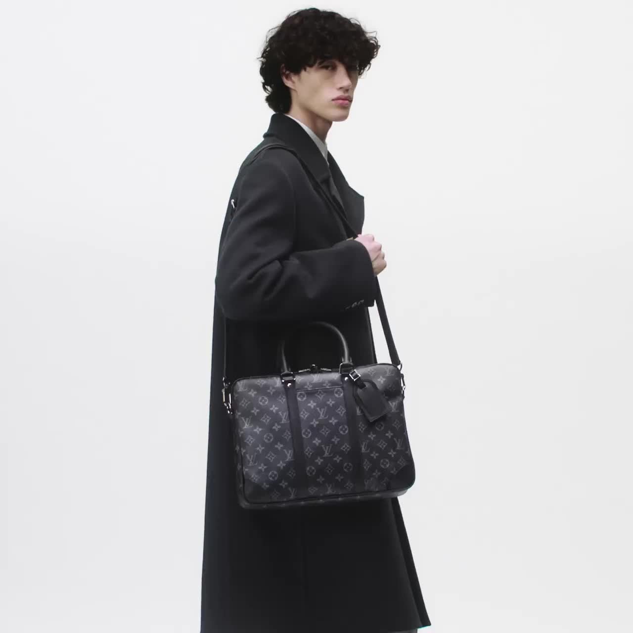 Il Porte-Documents Voyage PM è realizzato in tela Monogram Eclipse, negli intramontabili colori nero e grigio. L'accessorio, caratterizzato dalle linee essenziali, si distingue per i manici superiori, i dettagli laterali e gli angoli rinforzati in pelle. Il modello è completato dalla tracolla regolabile e amovibile, che consente varie opzioni di stile.