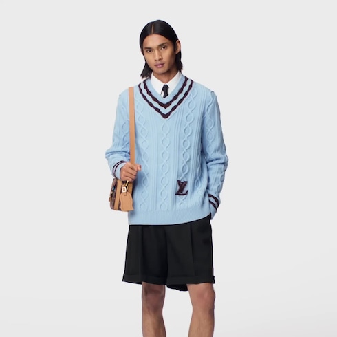 Il pullover, in maglia di lana spessa color blu chiaro, si distingue per la lavorazione intrecciata. L'esclusiva creazione rivisita il modello classico con un originale orlo smerlato sulle maniche, ripreso dai decori ondulati a contrasto che impreziosiscono lo scollo a V e i polsini. Le iniziali LV a intarsio, sulla parte inferiore, aggiungono un tocco Bon Ton al capo primaverile.