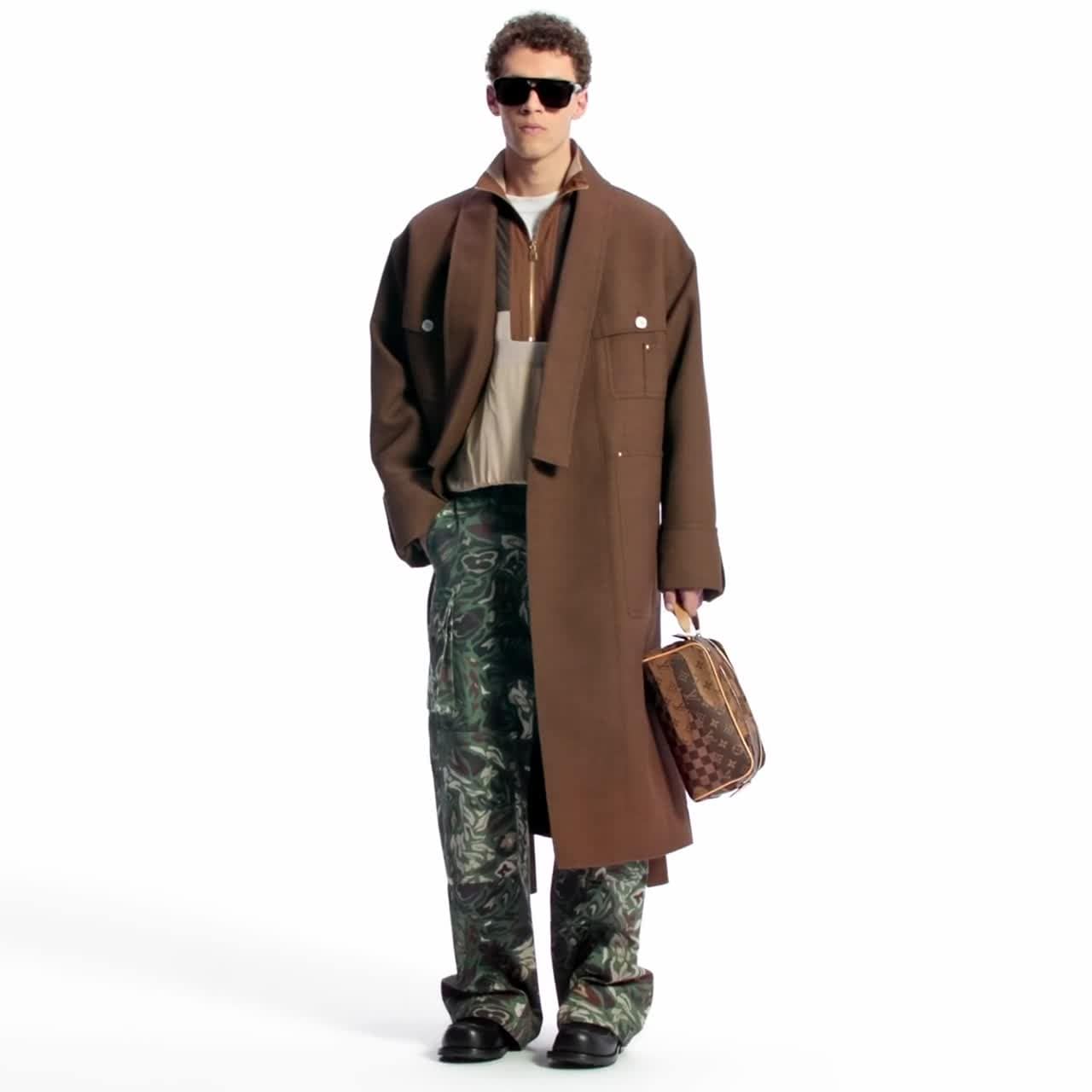 Il pullover ibrido d'ispirazione sportiva è realizzato in piqué di cotone beige con motivo Damier, inserti in nylon effetto color block nei toni del marrone e colletto con mezza zip. L'ampia tasca centrale è arricchita dal dettaglio con firma LV Japan, in omaggio alla collaborazione con Nigo. Il modello può essere abbinato agli shorts coordinati per un completo casual-chic.