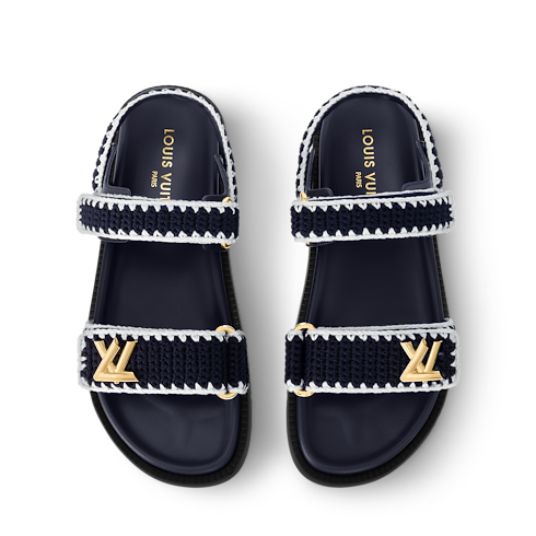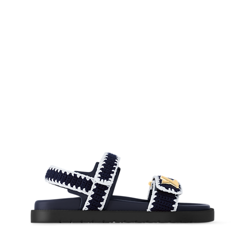 Il sandalo basso LV Sunset è reinterpretato in un'elegante versione in cotone lavorato all'uncinetto, che conferisce un raffinato tocco artigianale. L'esclusivo modello bicolore presenta due cinturini con velcro, di cui uno impreziosito dall'emblematico decoro LV Twist dorato. Il confortevole sottopiede anatomico imbottito e la leggera suola in gomma completano l'originale calzatura.